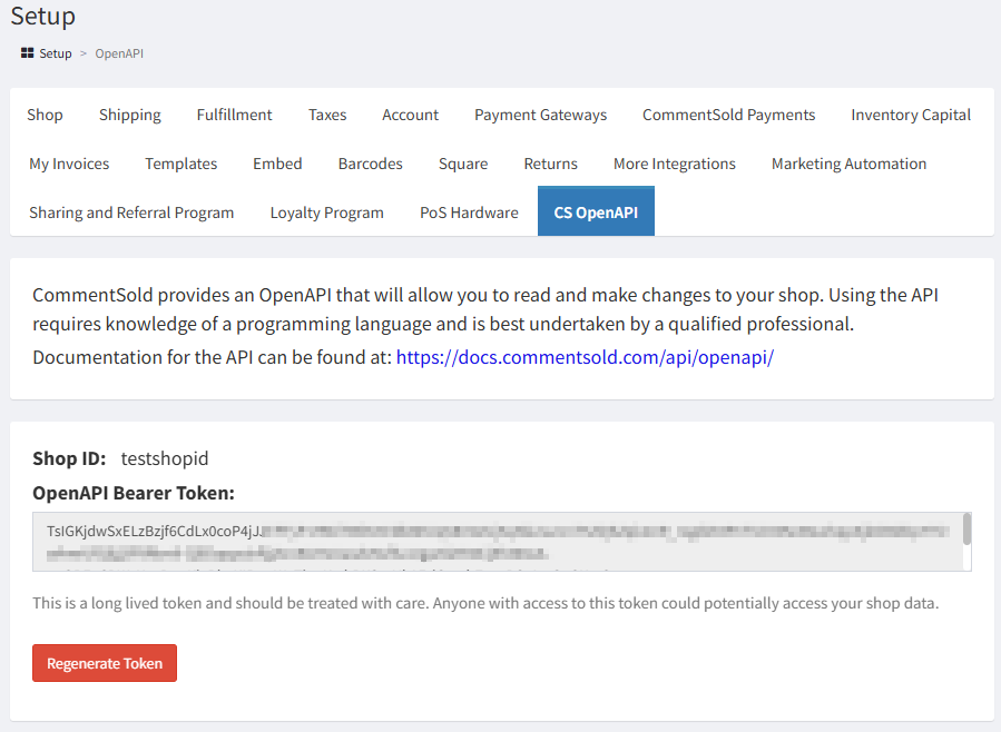4. Once you have the "CS OpenAPI" tab and have clicked on it, you will see a section that has your "Shop ID" and "OpenAPI Bearer Token". Keep this tab open, as you'll need this information in a moment: