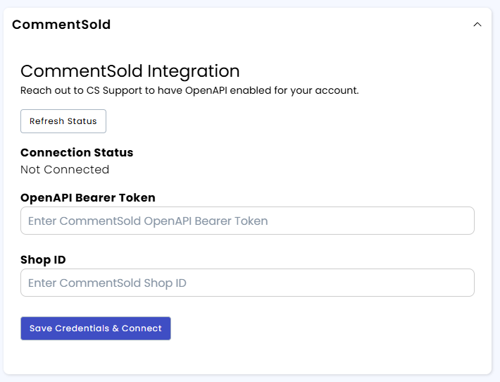 - Copy/paste the Shop ID and OpenAPI Bearer Token from your CommentSold tab into the two fields in the SellSavvy tab.